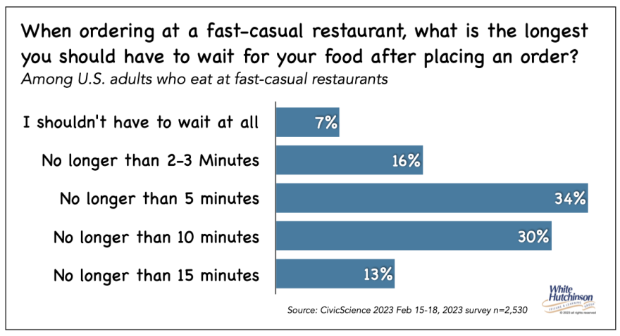 Another wait time consideration is how long it takes to get the food once it's ordered. A Civic Science survey of 2,300 people found that, at fast-casual restaurants, the highest concentration of maximum wait time falls between 5 minutes (34%) and 10 minutes (30%). However, nearly a quarter say the wait time at these restaurants should be under 3 minutes. Only 13% said they were willing to wait up to 15 minutes