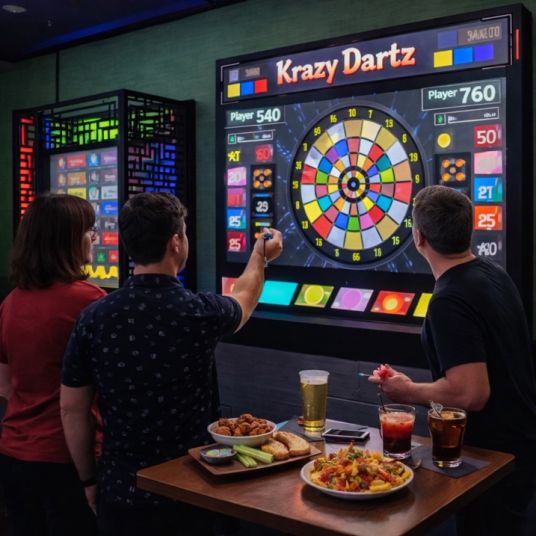 What makes this somewhat confusing is that the same game can be found in both types of venues. For example, regular darts have greater skill-level variance because they require significant practice to master, especially given their small targets. In a venue where only drinks are available to enjoy alongside the game, not food, that would be considered competitive socializing. Conversely, electronic darts with larger targets and a lower skill-level variance, such as Krazy Dartz, played in a setting where both food and drinks can be enjoyed at the same time, exemplifies social game entertainment.