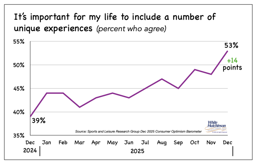 Since then, research from the Sports & Leisure Research Group has come out showing the growing importance of unique experiences. In just the last year, the importance of including a number of unique experiences in people's lives has grown from 39% of adults to 53%.