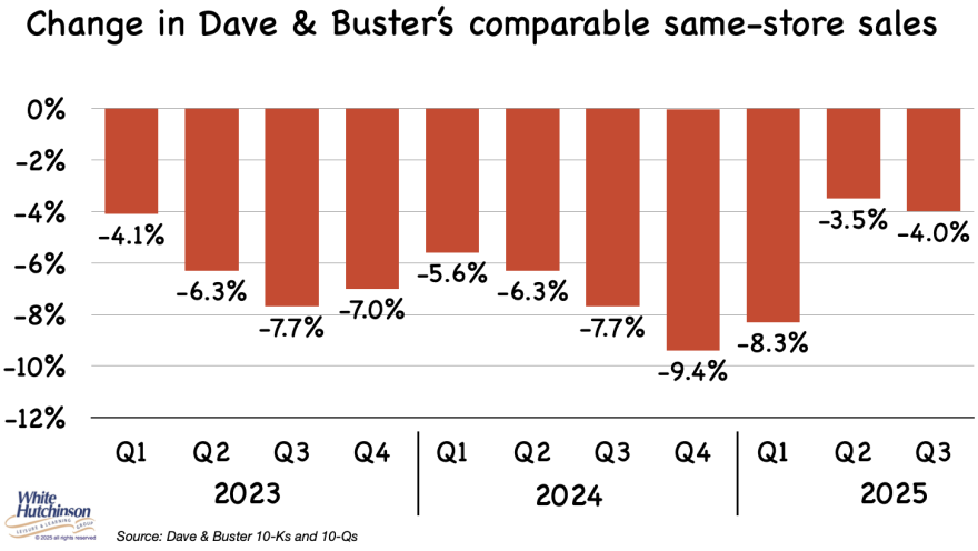 Dave & Buster's reported that its 2025 3rd quarter (Q3) comparable same-store sales declined 4.0% year over year. Their comparable same-store sales have declined for 11 consecutive quarters since Q1 2023.