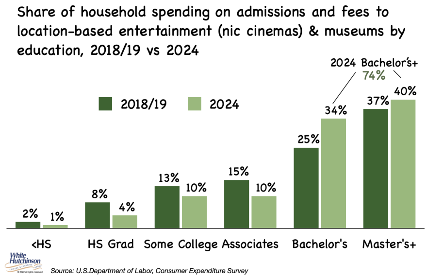 Spending has shifted to households headed by a person with a bachelor's degree or higher. That group now accounts for almost three-quarters of spending on fees and admissions to parks and museums (74%), up from 62% in 2019.