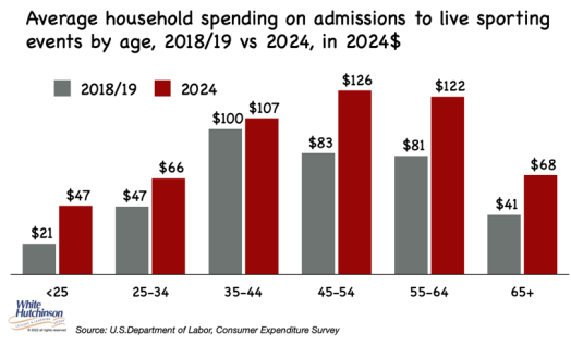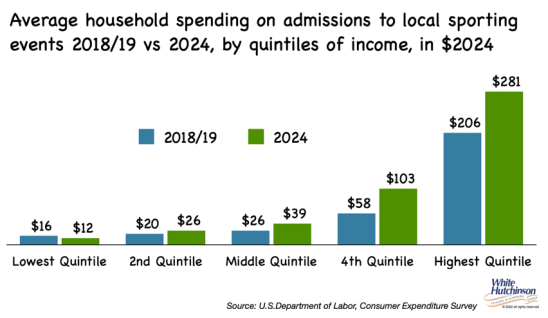 There appears to be a long-term trend of local out-of-home entertainment spending shifting to live events. Average household spending on admissions to local sporting events increased by 40%, from $65 in 2019 to $92 in 2024 (inflation-adjusted), across all household income quintiles, except the lowest, and all age groups.