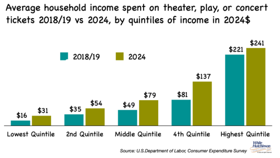 The same was true for tickets to live concerts, plays, theater, and opera. Average household spending increased 35% from $80 in 2019 to $109 in 2024 for all quintiles of income and for all household age groups, except for age 65+.