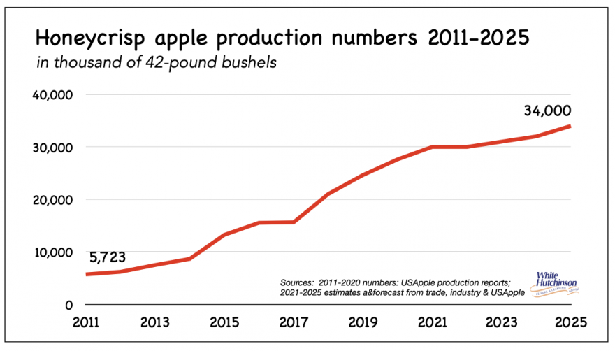 Since 2011, national production of Honeycrisp apples has increased roughly sixfold.