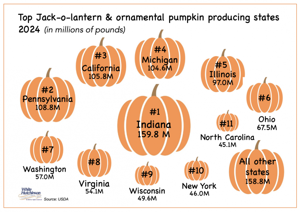 These are leading states producing pumpkins for ornamental use and jack-o'-lanterns for Halloween.