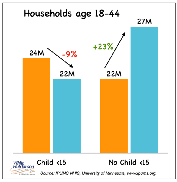 Although families with children will always be a key part of family-focused agritourism, they don't have to be the only focus. Younger adult households (18-44) are declining in number, mainly because of decreasing birthrates. In 2007, households aged 18-44 with children 14 and under made up most of the households. Their numbers have decreased by 9% in 2024, while the number of young adult households has increased by 23%, now making them the largest group among all young adult households.