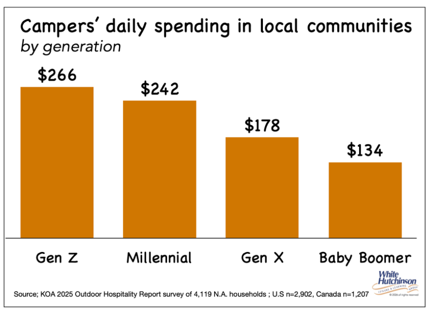 According to Kampgrounds of America's 2025 report, the youngest adults (18-44) accounted for 61% of new campers in 2024. Additionally, the youngest subgroup of 18-28-year-old campers (Gen Z) were the top daily spenders, averaging $266 per day, nearly double the $134 per day spent by Baby Boomers. Adults aged 29-44 spent almost as much as Gen Z, at $242 daily. The higher costs associated with their camping trips are intentional. The youngest group spends more on upgraded camping experiences by choosing more luxurious "glamping" sites over traditional RVs or tents, dining out more often, and investing in experiences and gear.