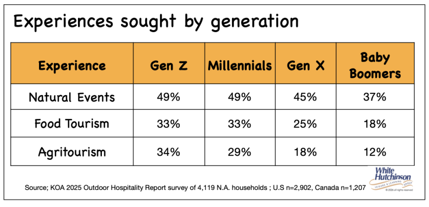 The same report lists the top experiences sought by campers by generation. For Gen Z, 34% are seeking agritourism experiences and 33% are interested in food tourism opportunities. The only experience more popular among this group was Natural Events. Millennials followed closely, with 29% looking for agritourism and 33% for food tourism. In comparison, only 12% of Baby Boomers pursue agritourism and 18% seek foodie tourism.
