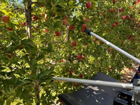 Harvesting labor is the single largest cost in production of apples and other tree fruits. USDA Agriculture Research Service researchers in East Lansing, MI in collaboration with Michigan State University, developed a new dual-arm harvesting robot to enhance fruit harvest efficiency and cost effectiveness. This new robot design provides a commercially viable solution to automated harvesting of apples.