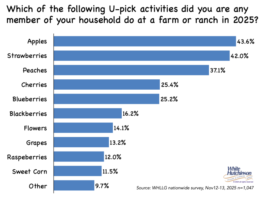 Here's the 2025 household participation results for U-pick crops. As in prior years, apple U-pick remains the most popular, with 43.6% participation, followed closely by strawberries. The survey found that less than one in five households (19%) did not participate in any type of U-pick in 2025.