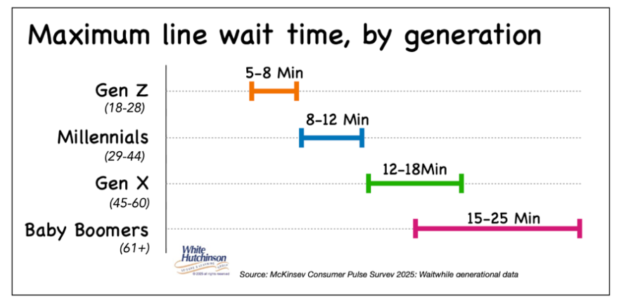 Service at most agritourism farms is the same as at fast casual restaurants – order at one location and pick up at another. For fast-casual restaurant diners, such as at Panera Bread or Shake Shack, the average customer will only wait 8 minutes before abandoning a queue. Gen Z and Millennials show the lowest tolerance for waiting in line.