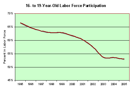 In our June 2005 article, Where have the teenage workers gone?, we reported on the declining number of available teenage workers. Data is now in for the month of July 2005, and the decline continues. In July 2005, only 53.0% of 16- to 19-year-olds were in the labor force. That is a decline from 53.6% in July 2004.