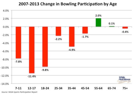 Although it might appear that the Great Recession that started in the end of 2007 is the cause of the decline, we are able to track the start of the decline in bowling participation back to 2006. And in reality, the decline is really more severe than the graph shows, as the population has been growing over the years, so the per capita participation rate has dropped more even drastically.