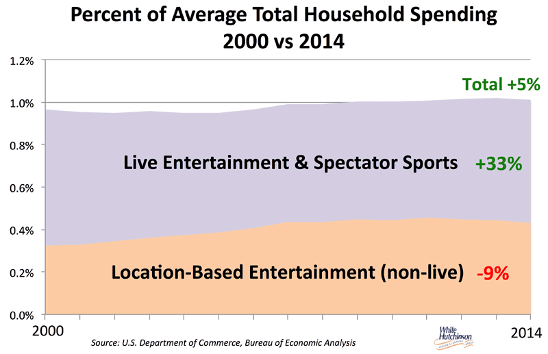 Offering live and limited time events is becoming increasingly important to attracting customers to location-based leisure venues. Since 2000, household spending on live entertainment and spectator sports events has increased by 1/3 while non-live location-based entertainment spending for such things as rides, attractions, movie theaters, FECs, theme parks, etc. has declined by almost 1/10 (-9%).