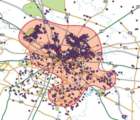 There is a direct relationship between length-of-stay and the amount of time people will spend traveling to a business. You might not be willing to spend more than 5 minutes traveling to a convenience store where you will only be for a few minutes. You'll drive 10 minutes or so to a grocery store where you might spend half an hour. You'll drive maybe one-half hour to go to the mall for a major shopping exhibition where you'll spend hours.