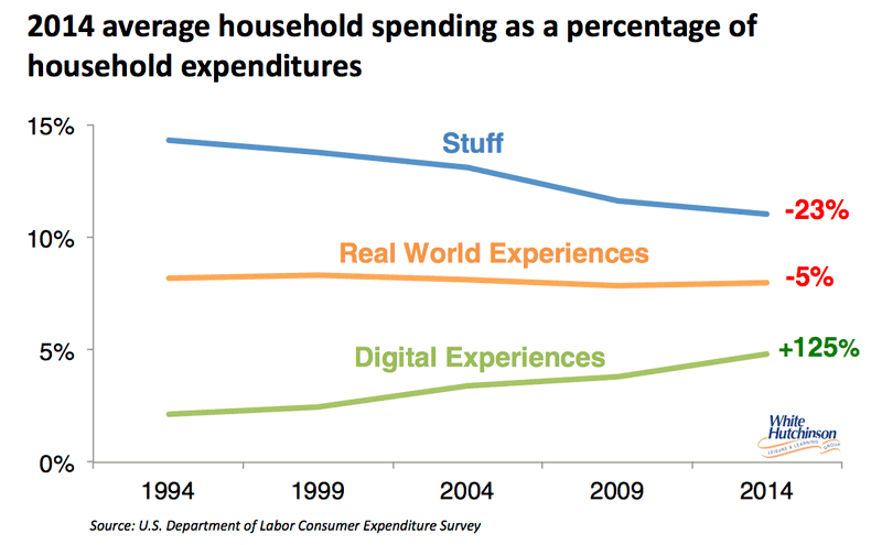 There is no question we are in the experience economy where people are increasingly spending less on accumulating stuff and more on experiences. However, the experience economy is fast evolving in a different direction than was foreseen not that many years ago, to a digital experience economy. If the trend continues, spending on stuff will continue to decrease and soon the majority of experience spending will be for the digital realm.