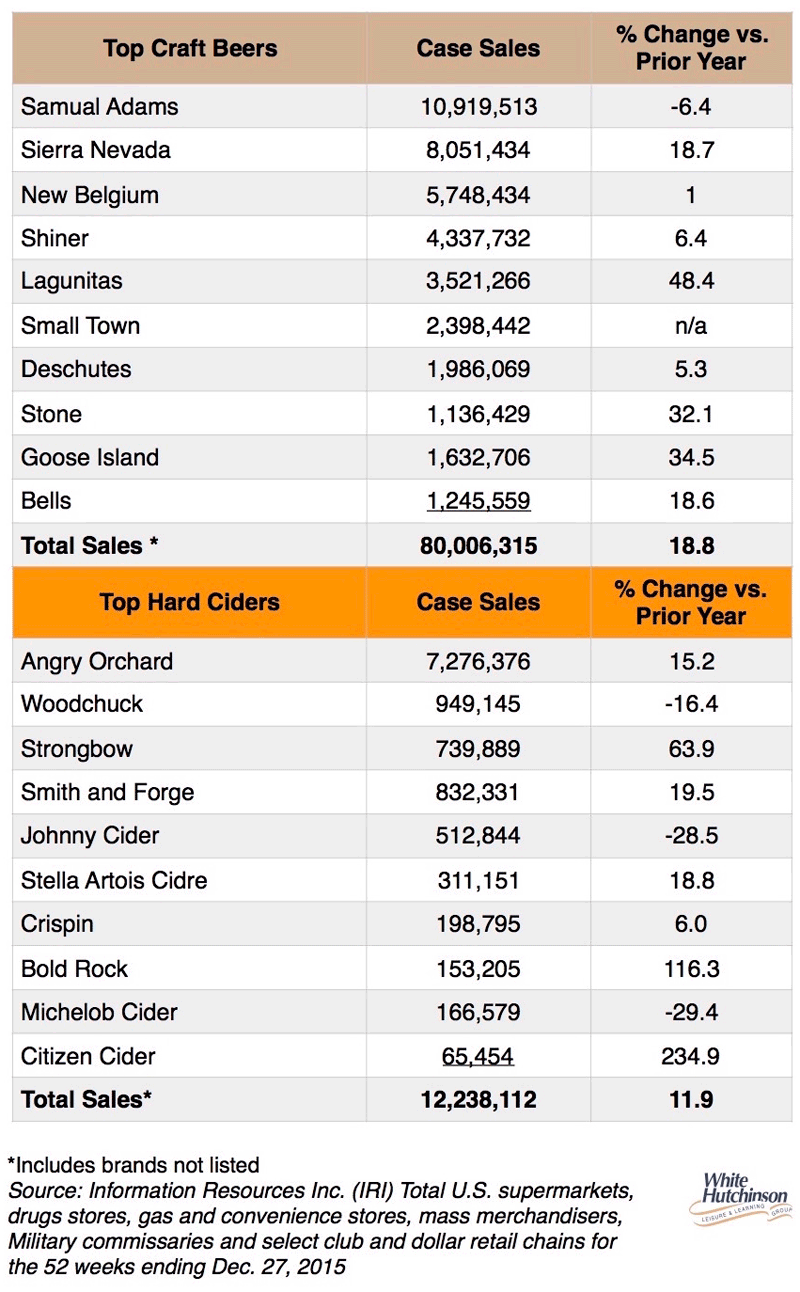 The following shows the breakdown of 2015's most popular beers (and hard ciders) by category in cases sold at retail locations and percentage change from the previous year.