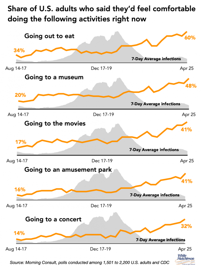 An April 21-26 CNN poll found that 63% of adults say that they'd feel comfortable returning to their regular routine today (or already have) based on what they know about the outbreak in their area. The April 25-May 1 CivicScience polling results found that 62% of adults are comfortable now eating in restaurants and 44% going to a movie theater. The results from all the above polls include vaccinated and unvaccinated people. Many unvaccinated people, especially younger adults and Republicans, feel safe going out. However, there still remains a majority of people who don't feel safe going to any LBE or cultural venue.