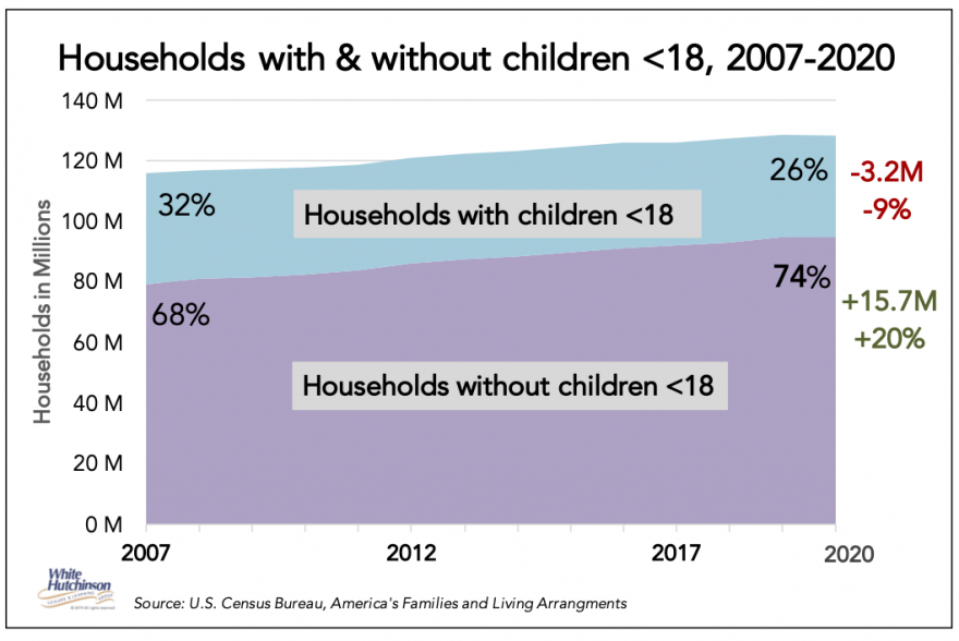 We see a corresponding trend in households with and without children of any age (younger than 18). We now have 3.2 million fewer households with any children. Households without children have grown by 15.7 million, from two-thirds to three-quarters of all households.