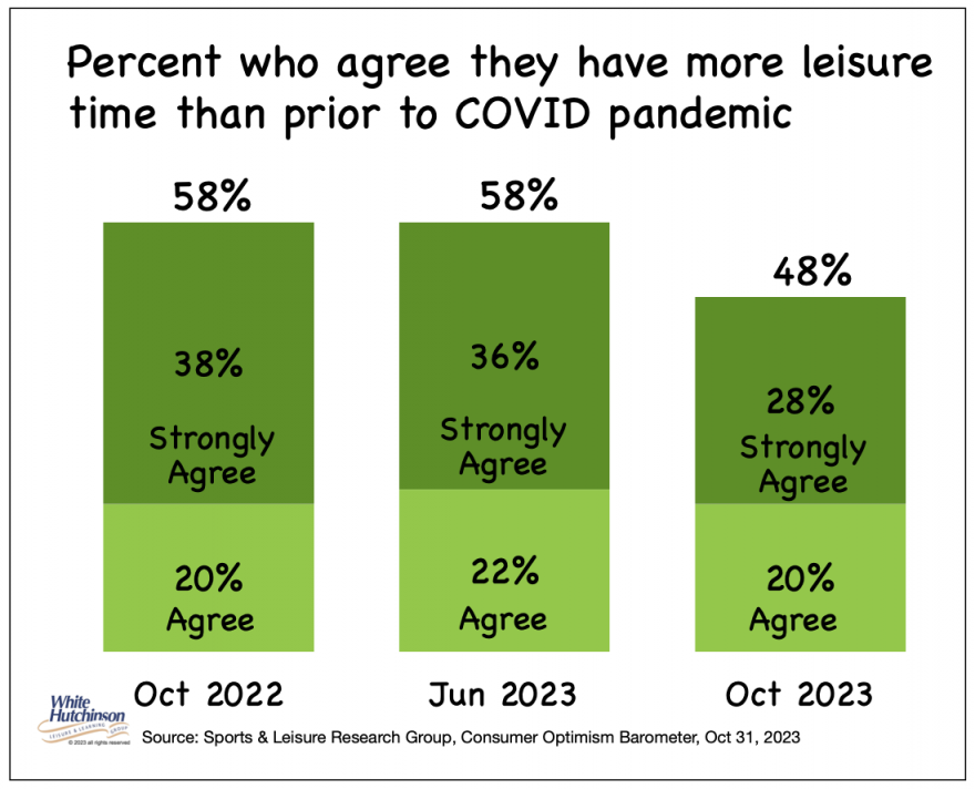 Indications are that the era of post-Covid leisure splurging from the pandemic's pent-up demand has ended, and the leisure market may become more competitive. There has been a ten-point drop in those active Americans who strongly agree that they have more leisure time than a year ago.