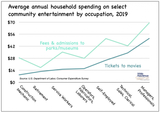 Occupational analysis reveals the same socioeconomic stratification. Managerial and professional households, with an average income of $137,600, represent 25% of all households but contribute to 43% of movie ticket spending and 47% of E&C fees and admissions.