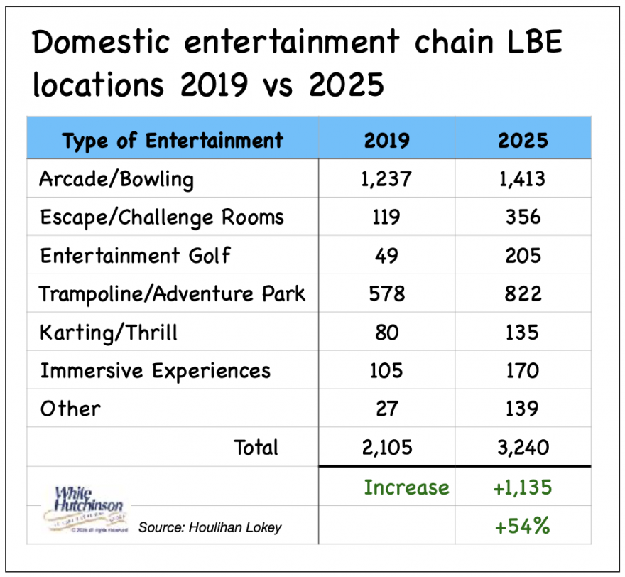 Since 2019, there's been a 54% growth in the number of chain location-based entertainment centers (LBEs) in North America.