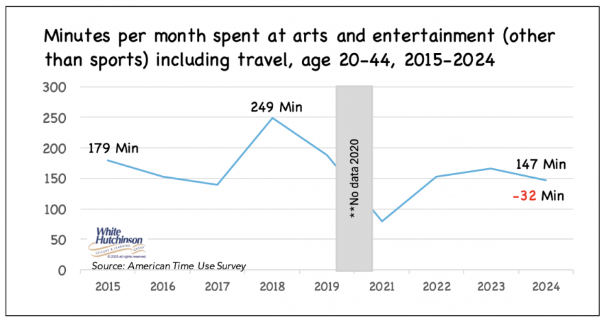 To put it another way, adults 20-44 spent nearly one-fifth less time (-18%) attending E&A venues in 2024 than 10 years ago and 42% less time than in 2019.