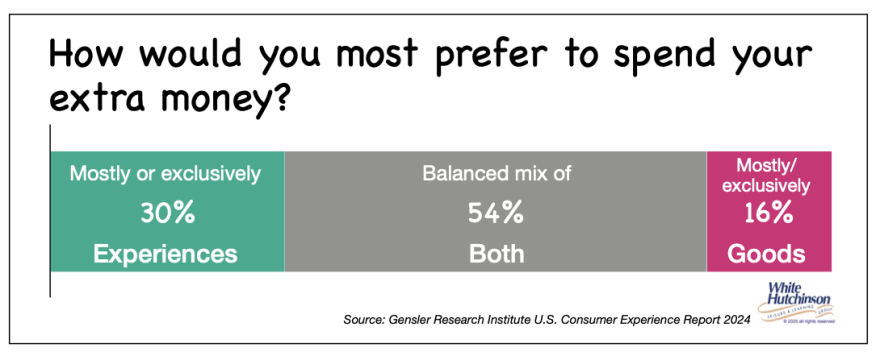 In 2024, the Gensler Research Institute conducted consumer research on "What makes an experience worth it?" They found there are two types of people: goods-focused and experience-focused. 30% were experience-focused, 16% were goods-focused, and 54% were a balanced mix of both.