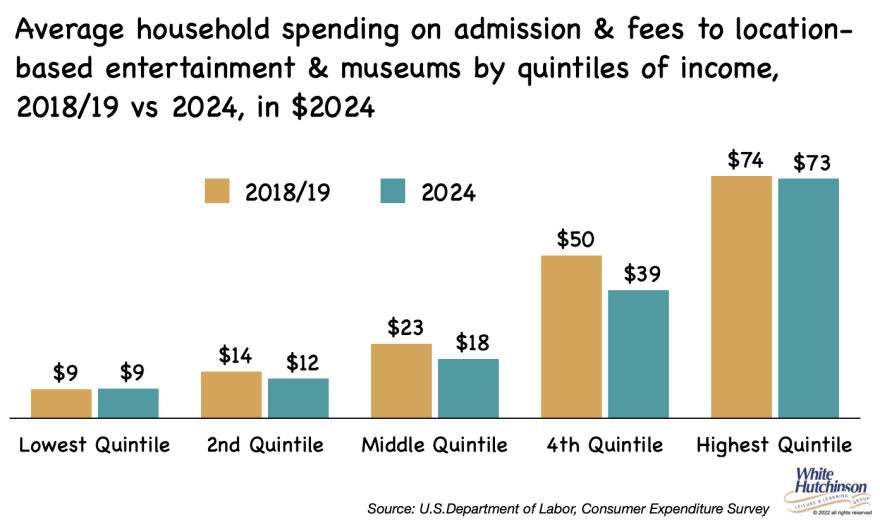 Spending has shifted to households headed by a person with a bachelor's degree or higher. That group now accounts for almost three-quarters of spending on fees and admissions to parks and museums (74%), up from 62% in 2019.