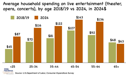 The same was true for tickets to live concerts, plays, theater, and opera. Average household spending increased 35% from $80 in 2019 to $109 in 2024 for all quintiles of income and for all household age groups, except for age 65+.